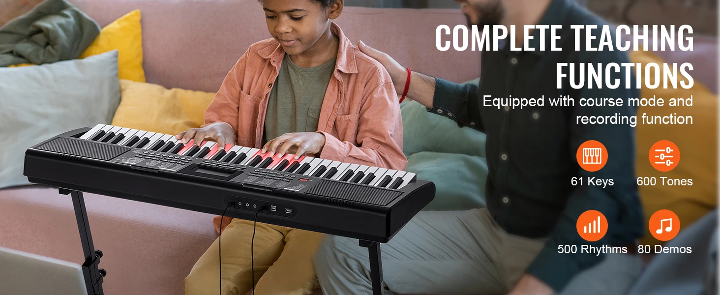 • With Stand——Discover the versatility of our 61-key keyboard piano, equipped with 600 tones, 500 rhythms, and 80 demo songs to inspire your musical creativity. The lighted keys guide finger placement and enhance learning, making it especially engaging for children and beginners.