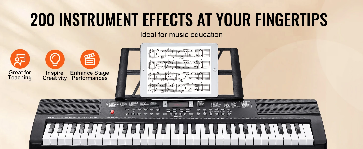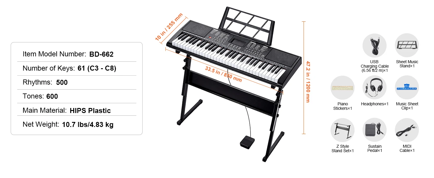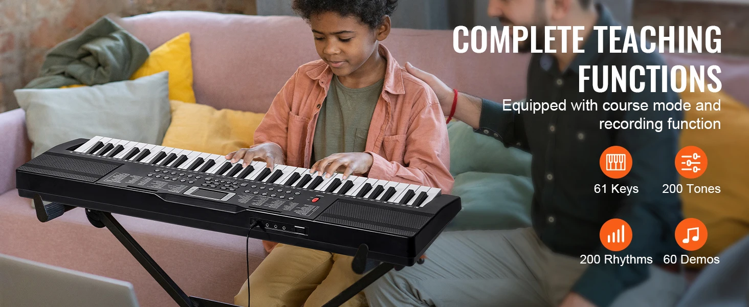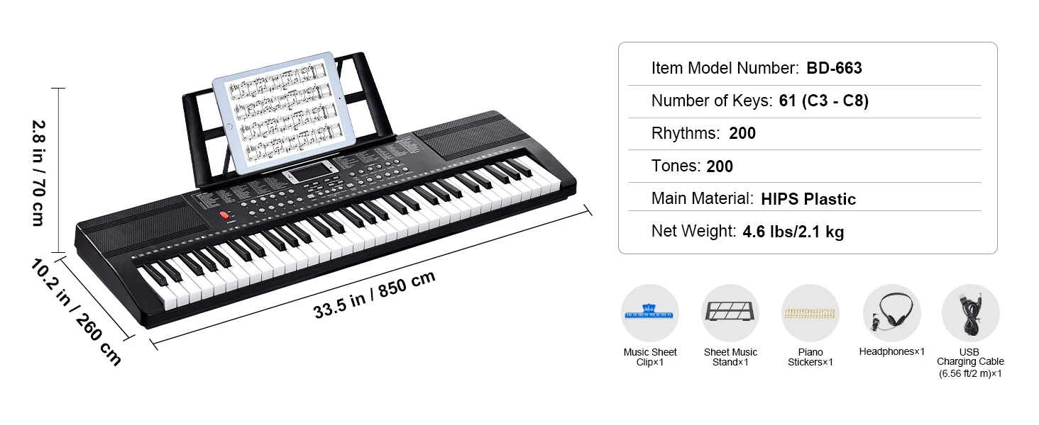 • Without Stand——Discover the versatility of our 61-key keyboard piano, equipped with 200 tones, 200 rhythms, and 60 demo songs to inspire your musical creativity. The standard-sized keys, combined with included piano stickers, make it easier for beginners to master finger placement and practice effectively.